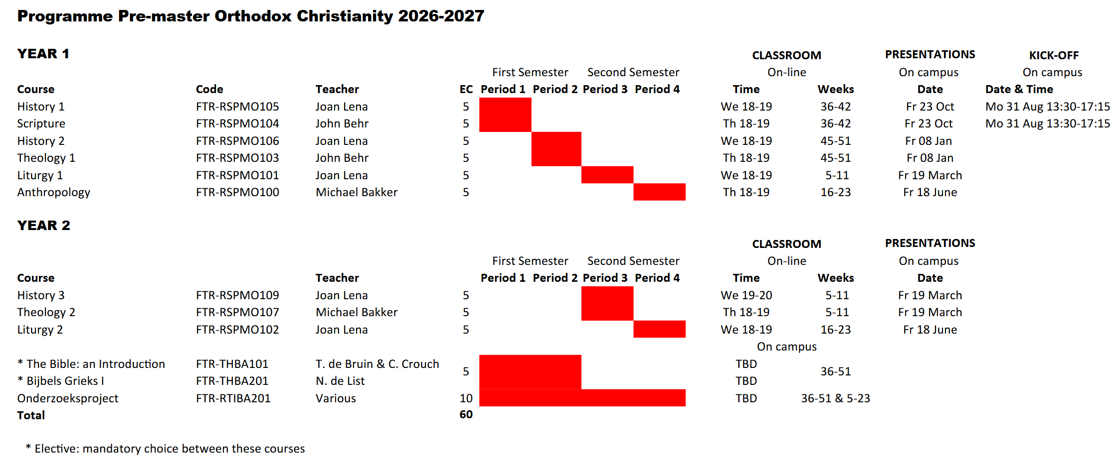 Het is nu mogelijk om je aan te melden voor de pre-master Orthodox Christianity voor het collegejaar 2026-2027. Deze parttime opleiding is verdeeld over twee studiejaren. De deadline voor inschrijving is 1 juli 2026. (N.B. de deadline en aanmeldingsprocedure kan verschillen afhankelijk van je vooropleiding en nationaliteit. Zie deze pagina van de universiteit voor alle informatie.) Meld je graag eerst aan bij ons instituut via het formulier onderaan deze pagina. Na contact met een van onze stafleden ontvang je informatie over het verdere verloop van je inschrijving.