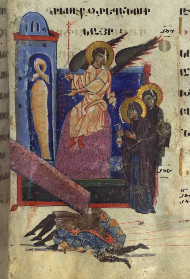 (Image: The myrrhbearing women at the tomb, T’oros Roslin Gospels, f.128r, Walters Art Museum, W.539.128R. Armenia, 1262)